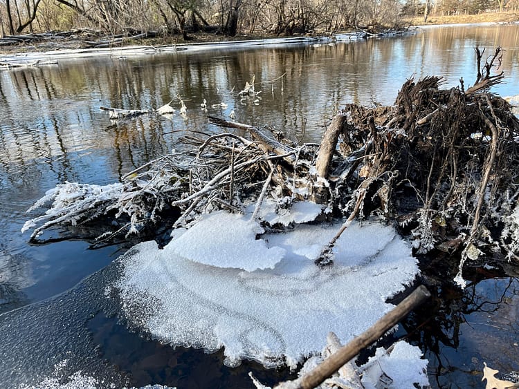 Again, I captured my thoughts. I quickly realized I was worrying about weather that was still to come. Some futuristic possibility. What a silly thing to do! Here I was in beautiful woods near a meandering river, and I was fretting about the possibility of a snowless winter. In my defense, I’ve lived through many cold winters that didn’t produce much snow. But why worry about it while I was supposed to be enjoying what I did have? Full sun. Invigorating cold. Deep woods. Solitude.